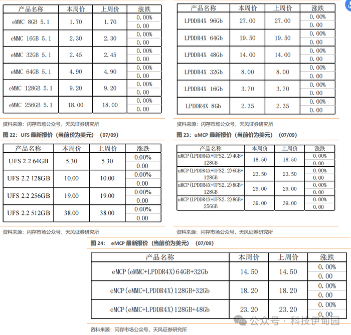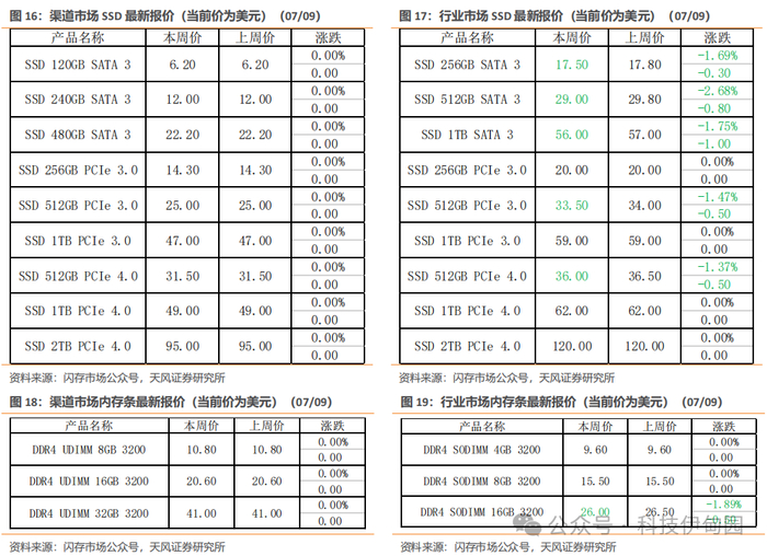 根据闪存市场公众号对存储行情的周度(截至 2024.07.09)评述,本周上游资源方面,NANDFlash Wafer 价格基本不变,DDR 颗粒价格多数小幅上扬。渠道市场方面,本周渠道 SSD和内存条市场整体趋于稳定,目前渠道市场仍处于倒挂状态,竞价出货主要集中在资源相对充裕且成本水位较低的低容量 SSD 市场,以缓解变现压力,而高容量成品市场则相对平稳。行业市场方面,受渠道市场传导影响,本周部分行业 SSD 和内存条价格小幅下调,整体相对稳定。目前现有库存成本随着低价库存的消耗而逐渐上升,存储厂商对于上游资源备货意愿较弱,行业客户需求相对较为稳定且近期询单增加,未见因急于出货而杀价的动作,但为稳定客户且贴近客户需求,部分存储厂商进行动态优化价格。嵌入式市场方面,本周嵌入式市场价格维持不变。由于二季度以来手机和 PC 终端备货需求放缓,加上传统淡季终端库存去化缓慢,消费终端需求普遍较弱。而快速上涨的存储价格也抑制了终端正常增长的存储需求,消费端存储价格拉涨动力越来越弱,涨幅呈逐季放缓的趋势。面向消费市场,供应端持小幅涨价的态度,需静待新一轮备货需求出现。