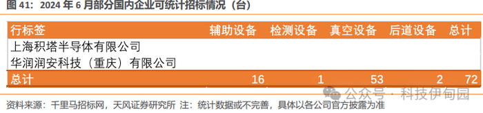 2024年6月可统计招标设备数量共72台,同比-118.18%。其中辅助设备16台,检测设备1台,真空设备53台,后道设备2台。