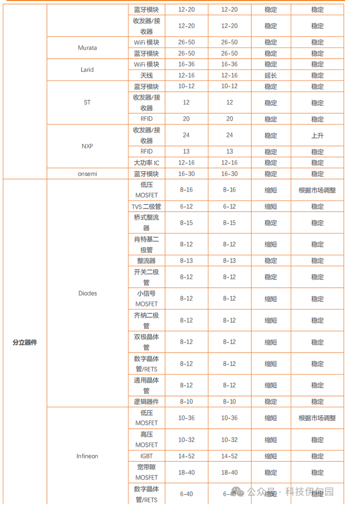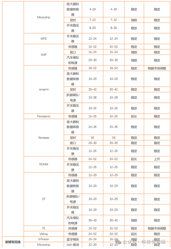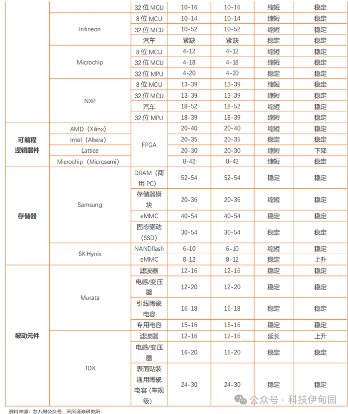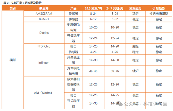 重点芯片供应商交期:从 6 月各供应商看,模拟芯片、传感器交期和价格趋稳,但模拟产品价格现象倒挂仍明显;分立器件交期进一步减少,价格波动下降;汽车 MCU 交期持续下降,价格趋稳,消费类 MCU 价格有小幅波动;存储和高端被动件价格持续回升。