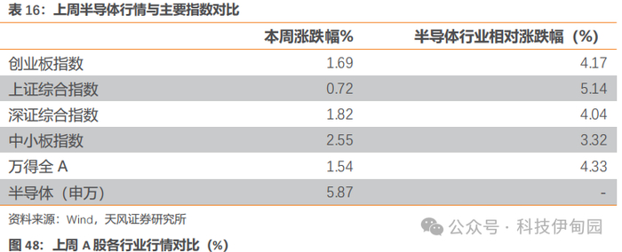 一周行情概览:上周半导体行情领先于全部主要指数。上周创业板指数上涨1.69%,上证综指上涨0.72%,深证综指上涨1.82%,中小板指上涨2.55%,万得全A上涨1.54%,申万半导体行业指数上涨5.87%,半导体行业指数领先于全部主要指数。半导体各细分板块全部上涨,其他板块涨幅最大,半导体材料板块涨幅最小。半导体细分板块中,封测板块上周上涨8.2%,半导体材料板块上周上涨1.6%,分立器件板块上周上涨7.9%,IC设计板块上周上涨7.8%,半导体设备上周上涨4.0%,半导体制造板块上周上涨4.7%,其他板块上周上涨11.1%。