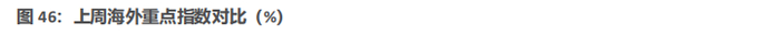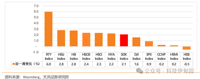 上周(07/06-07/13)海外各重点指数绝大部分上涨,费城半导体指数涨幅居中。其中 RTYIndex 涨幅最大为 6.0%,HSSI Index 跌幅最大为 0.5%。费城半导体指数涨幅为 2.1%,表现在海外各重点指数中居中。