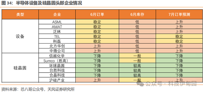 6月,设备行业维持弱势复苏态势,但硅晶圆客户库存较高,需求疲软持续。