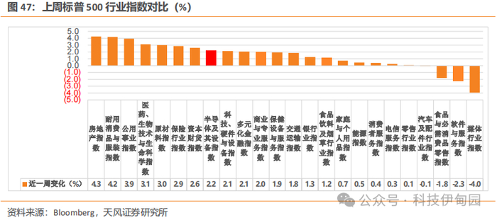上周(07/06-07/13)标普 500 行业指数涨跌不一,半导体及其设备指数上涨。其中房地产指数涨幅最大为 4.3%,媒体行业指数跌幅最大为 4.0%。