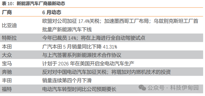 6 月,头部厂商加速海外市场布局,关注最新欧盟对华电动汽车加征关税影响。