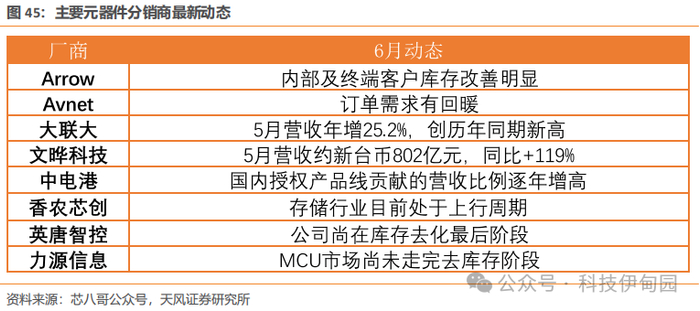 6月,分销厂商库存调整持续,部分产品需求得到改善,客户库存下降。