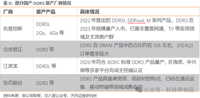长远看,随着三星、SK海力士及美光等头部厂商加速扩产HBM等高端应用品类,国产厂商在DDR3等中低端市场替代潜力巨大。从量产进展看,包括兆易创新及北京君正等均实现了规模出货,在DDR3产品性能比肩海外厂商,但料号数量方面仍有差距。