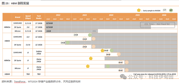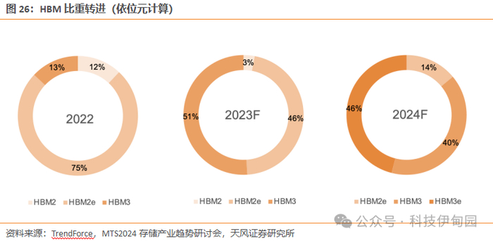 HBM迭代进程:2024年HBM2、HBM2e和3e的市场份额会发生比较明显的改变。2023上半年主流还是HBM2e,但是因为H100的问世,下半年HBM3就成为市场主流,很快2024年就会进行到HBM3e,因为它堆叠的层数更高,所以平均单价一定要比现在再高20%-30%以上,所以它对产值的贡献会更明显。