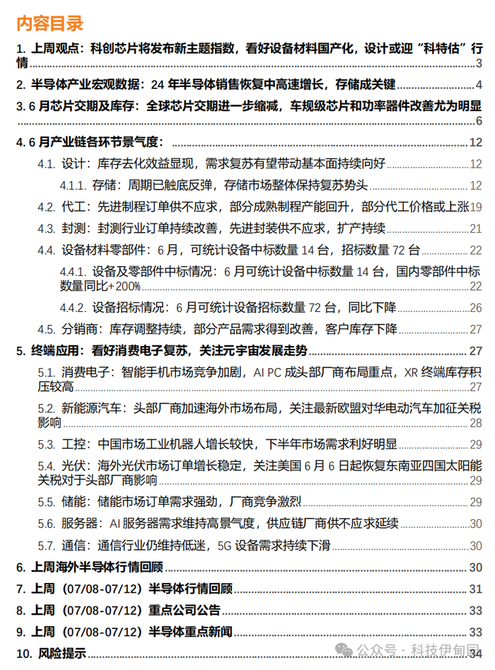 科创半导体即将发布新主题指数,看好设备材料国产化进程,设计或迎“科特估”行情。上交所7月14日公告,将于2024年7月26日正式发布上证科创板芯片设计主题指数和上证科创板半导体材料设备主题指数,为市场提供更多科创板半导体产业投资标的。我们认为新主题指数的发布将为投资者提供更多的投资工具,下半年半导体行业进入传统旺季,预计三四季度随着下游消费电子新机发布,全产业链需求端或迎来逐季改善,芯片设计板块业绩或将边际改善,叠加新主题指数的发布,有望迎来“科特估”行情,供给侧看好半导体设备材料国产化进程,近期鼓励半导体产业发展政策频发,叠加大基金三期的推动,看好卡脖子环节加速突破,预计大陆设备材料国产化率有望加速提升,产业链相关机会值得关注。