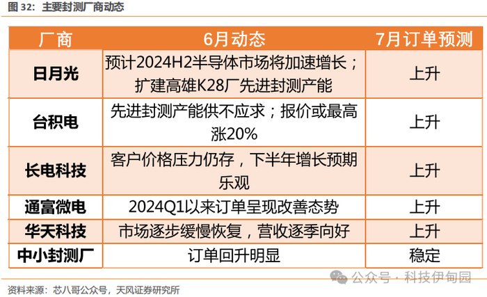 6 月,封测行业订单持续改善,先进封装供不应求,扩产持续。日月光预计 2024H2 半导体市场将加速增长;扩建高雄 K28 厂先进封测产能。台积电表示先进封测产能供不应求;报价或最高涨 20%。长电科技 6 月产能利用率约 70-80%,客户价格压力仍存,下半年增长预期乐观。通富微电 6 月产能利用率达 70-80%,2024Q1 以来订单呈现改善态势。华天科技 6 月产能利用率达到 80%-85%。