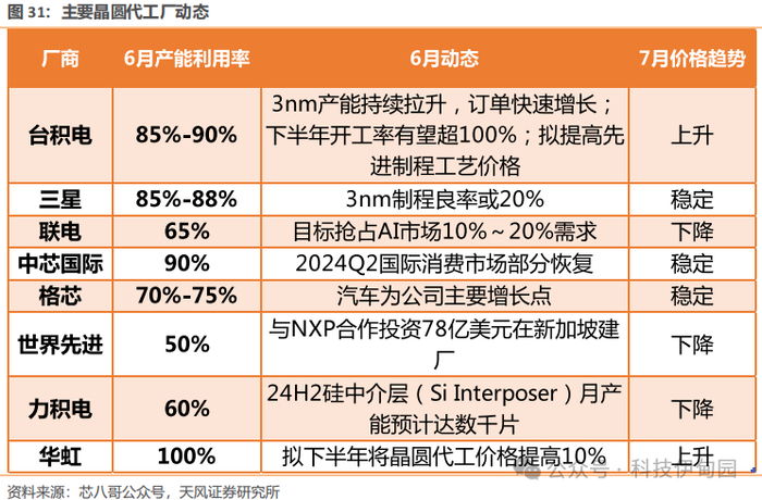 6 月,先进制程订单供不应求,部分成熟制程产能回升,部分代工价格或上涨。