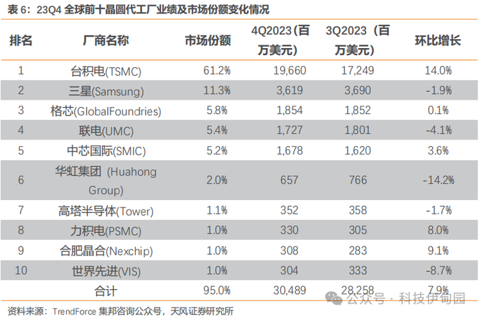 TrendForce集邦咨询研究显示,2023年第四季全球前十大晶圆代工业者营收季增7.9%,达304.9亿美元,环比增长7.9%,回暖迹象明显。主要受惠于智能手机零部件拉货动能延续,包含中低端Smartphone AP与周边PMIC,以及Apple新机出货旺季,带动A17主芯片、周边IC如OLED DDI、CIS、PMIC等零部件。其中,台积电(TSMC)3nm高价制程贡献营收比重大幅提升,推升台积电第四季全球市占率突破六成。
