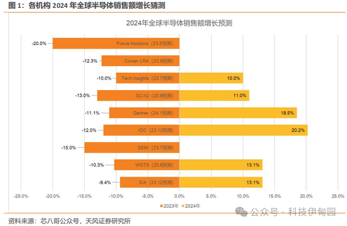 行业内多家主流机构都比较看好 2024 年的半导体行情。其中,WSTS 表示因生成式 AI 普及、带动相关半导体产品需求急增,且存储需求预估将呈现大幅复苏,因此 2024 年全球半导体销售额将增长 13.1%,金额达到 5,883.64 亿美元,再次创历史新高;IDC 的看法比WSTS 乐观,其认为 2024 年全球半导体销售额将达到 6328 亿美元,同比增长 20.20%;此外,Gartner 也认为 2024 年全球半导体销售额将迎来增长行情,增长幅度将达到 16.80%,金额将达到 6328 亿美元。