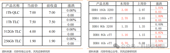 上游资源方面,本周 NAND Flash Wafer 价格基本不变,DDR 颗粒价格多数小幅上扬,DDR4 16Gb 3200/16Gb eTT/8Gb eTT/4Gb eTT 价格调整至 3/2.7/1.16/0.7,DDR4 8Gb 3200价格维持不变。