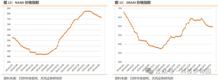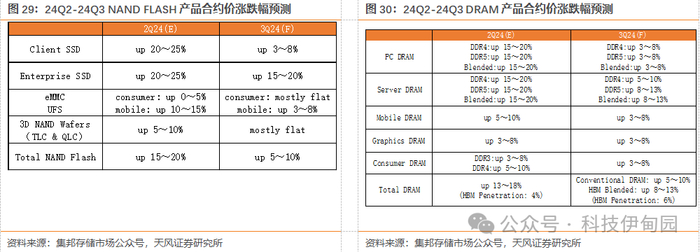 2024年第三季度价格预判:1)NAND : 第三季除了企业端持续投资服务器建设,尤其Enterprise SSD受惠AI扩大采用,继续受到订单推动,消费性电子需求持续不振,加上原厂下半年增产幅度趋于积极,第三季NAND Flash 供过于求比例(Sufficiency Ratio)上升至2.3%,NAND Flash均价(Blended Price)涨幅收敛至季增5-10%。2)DRAM: 由于通用型服务器(general server)需求复苏,加上DRAM供应商HBM生产比重进一步拉高,使供应商将延续涨价态度,第三季DRAM均价将持续上扬。DRAM价格涨幅达8~13%,其中Conventional DRAM涨幅为5-10%,较第二季涨幅略有收缩。