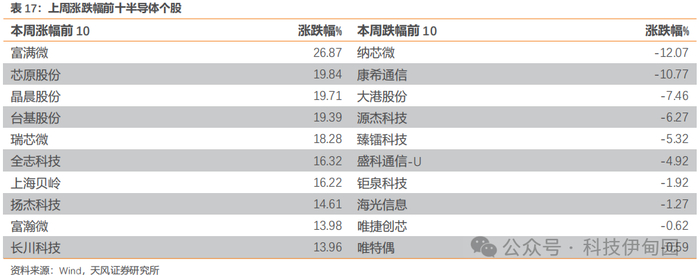 上周半导体板块涨幅前 10 的个股为:富满微、芯原股份、晶晨股份、台基股份、瑞芯微、全志科技、上海贝岭、扬杰科技、富瀚微、长川科技。