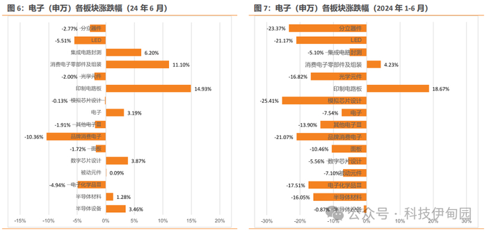 半导体细分板块:2024 年 6 月,申万指数各电子细分板块涨跌不一。涨幅居前三名分别为印刷电路板(14.93%)、消费电子零部件及组装(11.10%)和集成电路封测(6.20%)。跌幅居前三名分别为品牌消费电子(-10.36%)、LED(-5.51%)和电子化学品Ⅲ(-4.94%)。