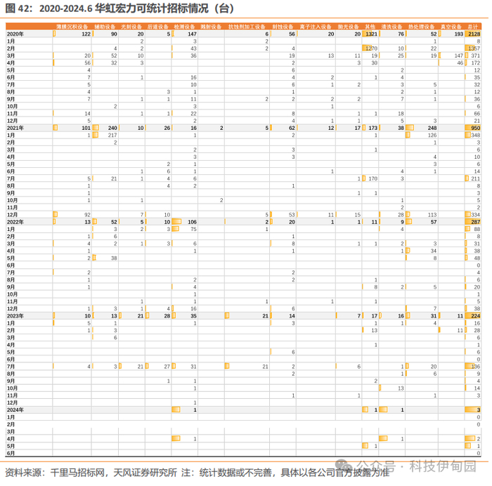 2020-2024年6月,华虹宏力可统计招标设备共3592台,包括246台薄膜沉积设备、395台辅助设备、56台光刻设备、69台后道设备、305台检测设备、2台溅射设备、34台抗蚀剂加工设备、152台刻蚀设备、33台离子注入设备、45台抛光设备、1523台其他设备、140台清洗设备、388台热处理设备、204台真空设备。