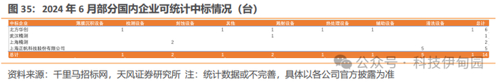 2024 年 6 月可统计中标设备数量共计 14 台,同比-33.33%。其中辅助设备 5 台,检测设备 2 台,刻蚀设备 1 台,其他设备 2 台,热处理设备 1 台,溅射设备 1 台,清洗设备 1 台,薄膜沉积设备 1 台。
