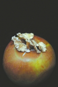 在木头上的,从苹果里长出的蘑菇