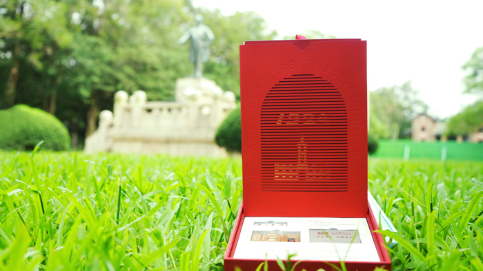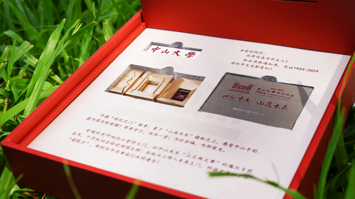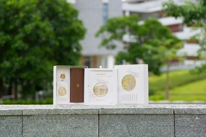 礼盒印有广州校区南校园中区大草坪、中大世纪华诞标识以及标志性的大榕树,体现百年校庆主题和中大精神,寓意“百年树人、欣欣向荣” 。