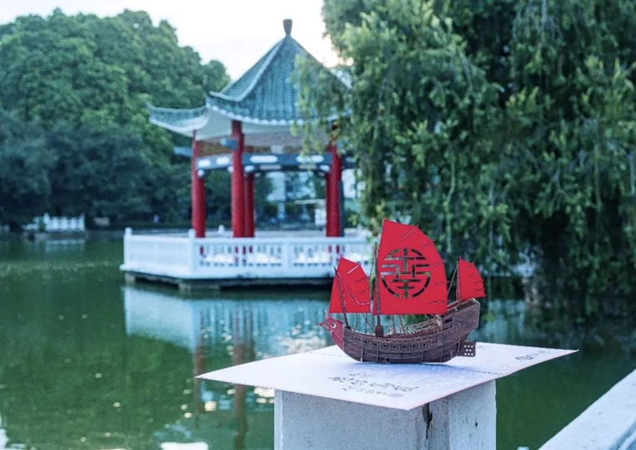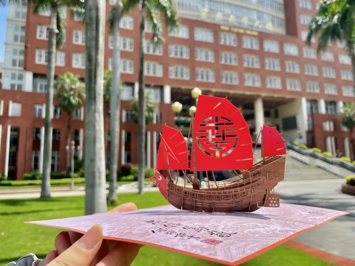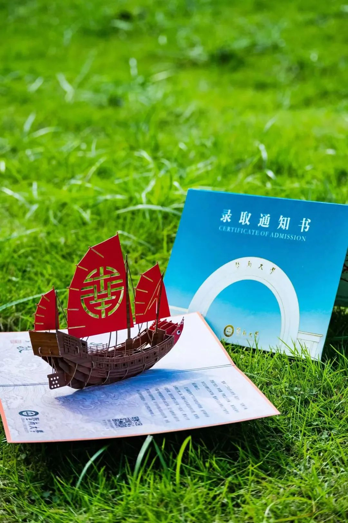 随录取通知书一同寄出的还有“暨南船说”——暨南红船纪念贺卡。打开纪念贺卡,一艘红帆木质红头船造型霎时挺立,船身剪纸工艺细腻精致,加上船头醒目精神的“大眼鸡”,在一方小小的纸面上乘风破浪。