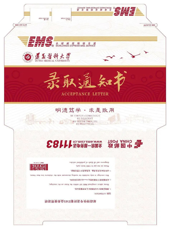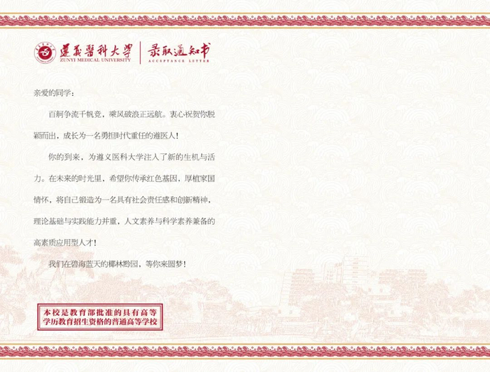 遵义医科大学录取通知书邮件封面以大连路校区、新蒲校区、珠海校区线条图为底,融入山与海的元素,寓意山海交响,逐梦远航。