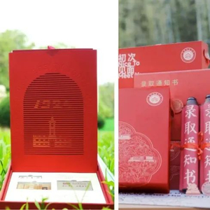 其中,折叠式录取通知书采用了对开门设计,中间点缀有校徽样式的磁吸扣,简约而不失大气。