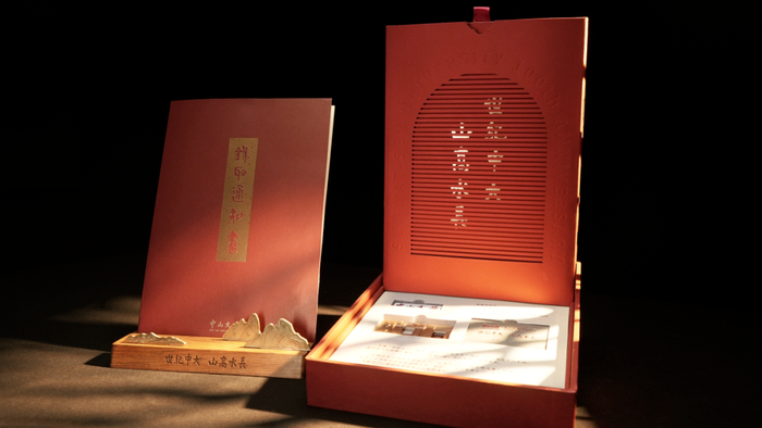 中山大学2024年录取通知书礼盒名为“百年树人”,外形沿用红砖样式的长方形盒子,内里新增“山高水长”木质镇纸底座,礼盒内还有2024级本科新生留念校徽。