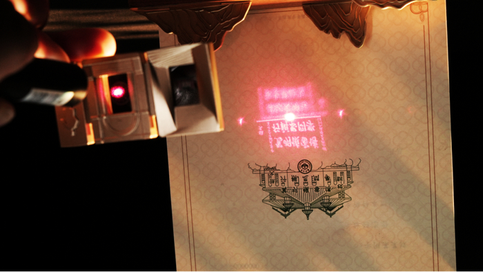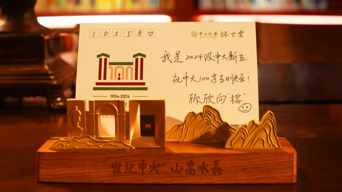 通知书礼盒中满满都是科技感,其中最亮眼的是一个金色的“世纪之门”徽章,以数字“100”的形态汇聚光影。在这扇门当中还大有“门道”,其中镶嵌了一枚雕刻有中大校徽的全息光学石英片,学生们通过光源(如激光笔)照射石英片后,即可在墙面投射出孙中山先生亲笔题写的校训图案。