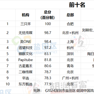 疯狂小杨哥、刘耕宏、李佳琦、贾乃亮、陶白白Sensei等顶流主播的MCN机构三只羊、无忧传媒、美ONE、遥望科技、蜂群文化位列《2024胡润中国流量新势力百强榜》TOP 5。