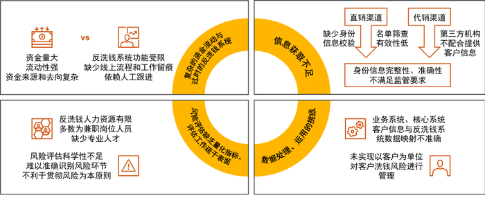主要体现在信托公司反洗钱管理资源相对紧张,又缺乏充分的外部信息支撑和可落地的方法论参考;自行建立客户评级模型、交易监测模型、机构洗钱自评估模型等存在困难;直接采购系统供应商成品解决方案而未经任何调整,又常常不能完全适用和匹配机构的实际情况;甚至有义务机构错误地认为拥有模型就是已经履职合规,未将监管要求在业务实践中进行有效落实;以及对于合规投入和勤勉尽责底线把握不当,仅仅通过“写报告”的定性风险评估方式难以应对日益严格的监管要求等方面。