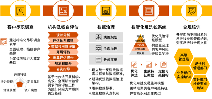 针对以上痛点与挑战,信托公司应当遵循“风险为本”的原则,合理评估自身业务风险与管控能力,从实际出发,把握合规资源投入与控制效果产出的平衡点,不断提升反洗钱管理的数智化水平。结合过往非银金融机构反洗钱合规实践经验,建议信托公司关注重点及高风险领域,从以下五个方面开展工作,提升反洗钱工作效率和合规水平: