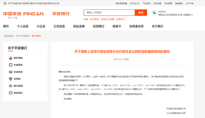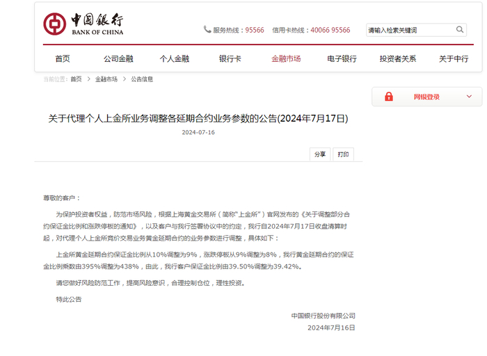 中国银行公告称,为保护投资者权益,防范市场风险,根据上海黄金交易所官网发布的《关于调整部分合约保证金比例和涨跌停板的通知》,以及客户与我行签署协议中的约定,我行自2024年7月17日收盘清算时起,对代理个人上金所竞价交易业务黄金延期合约的业务参数进行调整,具体如下: