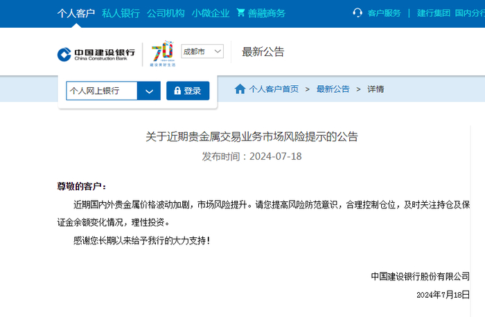 7月18日,建设银行发布公告称,近期国内外贵金属价格波动加剧,市场风险提升。请提高风险防范意识,合理控制仓位,及时关注持仓及保证金余额变化情况,理性投资。