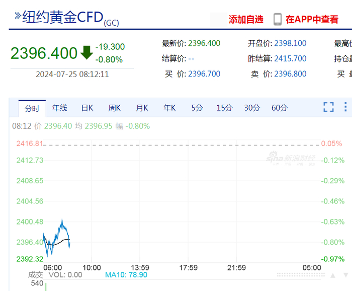 截至7月25日发稿,纽约黄金报2396.4/盎司,日内跌0.80%,现货黄金报2396.67/盎司,跌幅0.02%。