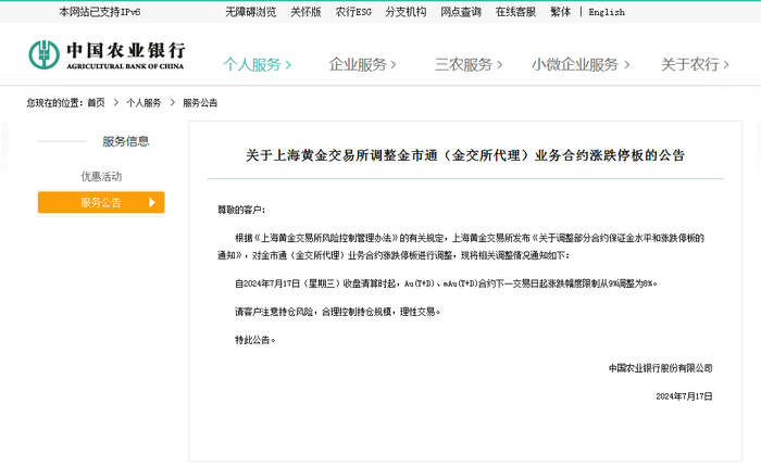 7月17日,农业银行发布公告称,根据《上海黄金交易所风险控制管理办法》的有关规定,上海黄金交易所发布《关于调整部分合约保证金水平和涨跌停板的通知》,对金市通(金交所代理)业务合约涨跌停板进行调整。自2024年7月17日收盘清算时起,Au(T+D)、mAu(T+D)合约下一交易日起涨跌幅度限制从9%调整为8%。农业银行特别提示表示,“请客户注意持仓风险,合理控制持仓规模,理性交易”。