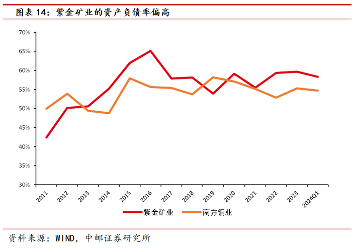 相较南方铜业,紫金矿业的资产负债率偏高。2016年以来紫金矿业并购、投资较为频繁,长期借款增多的同时资产规模大幅扩张,16年一度来到65.1%。近3年,随着铜价在疫情后大涨并维持在历史高位,公司盈利大增,资产负债率总体呈现下降趋势。而南方铜业的资产负债率处于中等水平,截至24年Q1为54.7%;而紫金矿业收并购项目较多,资产负债率虽较高位有所降低,2024年Q1为58.30%左右。
