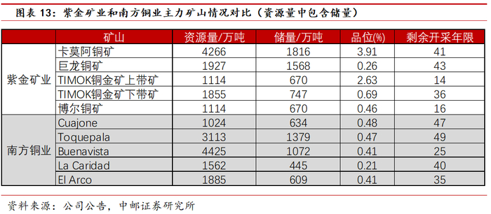 南方铜业的矿山寿命在所有铜生产商中遥遥领先,拥有4个大型露天矿由于资源储备丰富,虽然公司矿山均已服役超过40年,但可采年限还有70年左右,即使考虑到2028年后公司扩产,可采年限仍有50年,领先于同类的其他知名矿企。