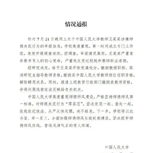 7月22日,随着中国人民大学发布情况通报,王贵元被开除党籍、撤销教授职称、取消研究生指导教师资格等,警方介入调查,“人大教授性骚扰女博士”事件告一段落。