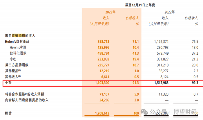 然而,加盟模式对海伦司的业绩贡献度并不高。财报显示,2023年公司直营酒馆收入1.03亿元,占比91.3%;而自特许合作服务、合伙人门店货品销售收入合计为1.05亿元。