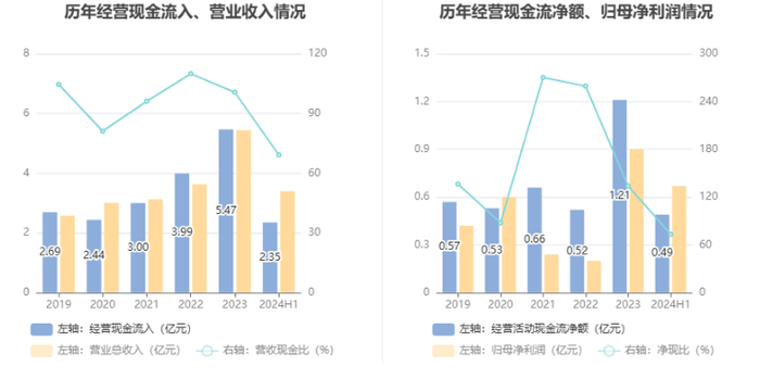 2024年上半年,公司营业收入现金比为69.19%,净现比为73.37%。