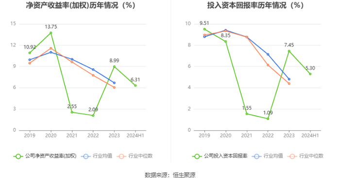 数据显示,2024年上半年公司加权平均净资产收益率为6.31%,较上年同期增长2.82个百分点;公司2024年上半年投入资本回报率为5.30%,较上年同期增长2.41个百分点。
