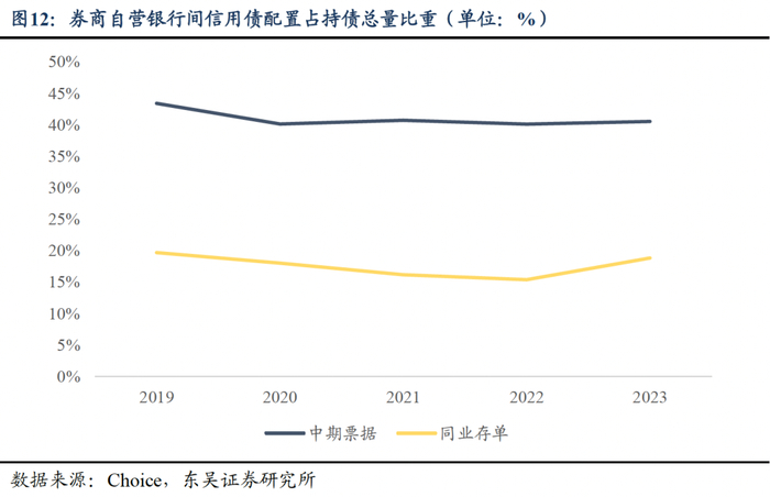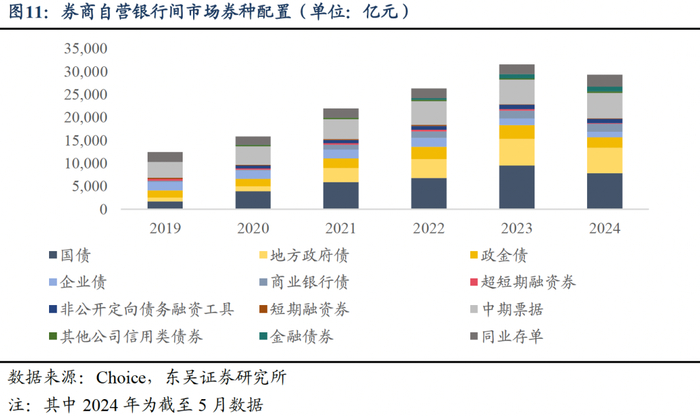 券商自营银行间投资品种均衡分布,兼顾风险与收益。通过选取的部分银行间券种配置,我们发现截至2024年5月,配置规模最大的券种为国债,规模约为7900亿元,其次为中期票据,规模约为5600亿元。国债的配置规模在2021年后上升并反超中期票据,这与国债发行量攀升且“债牛”趋势相关,券商自营一方面用国债作为底仓,另一方面偏好具备高票息特点的信用债来满足考核目标。此外,从信用债内部配置结构来看,同业存单与中期票据分别占信用债投资规模的比例从2019年以来稳定在40%和20%左右,属于信用债中券商倾向投入的产品。