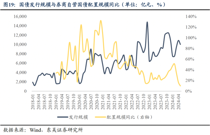 券商对于国债配置额度与国债发行数量呈现负相关关系。当国债的发行规模增加时,商业银行会增加持有支持国债支出,这导致券商对于国债的配置额度减少,因此券商自营的配置规模与利率债发行数量呈现一定的反方向变动关系,这一现象在2022年国债发行量上升后愈发明显。