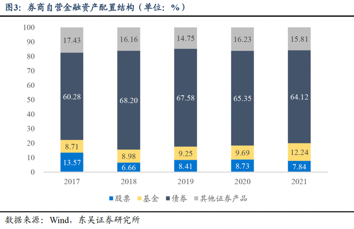 我们结合股市情况对券商自营业务发展情况进行分析,分别选取了2017年、2018年和2021年作为牛市、熊市和震荡市的代表,发现自营业务具有明显的顺周期性。