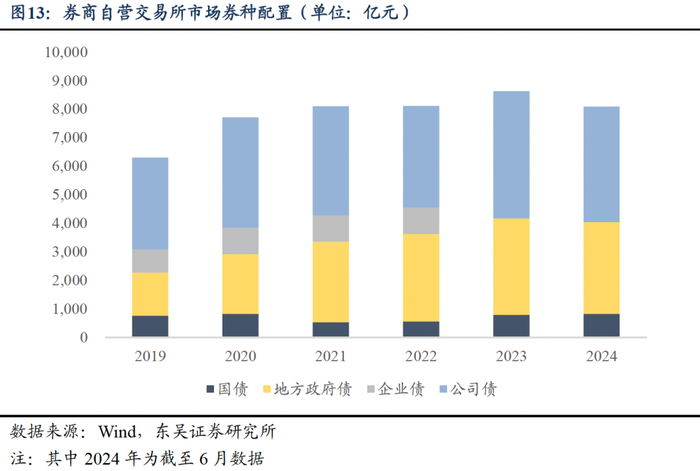 券商自营银行间投资品种均衡分布,兼顾风险与收益。截至2024年5月,配置规模最大的券种为国债,规模约为7900亿元,其次为中期票据,规模约为5600亿元。国债的配置规模在2021年后上升并反超中期票据,这与国债发行量攀升且“债牛”趋势相关,券商自营一方面用国债作为底仓,另一方面偏好具备高票息特点的信用债来满足考核目标。从信用债内部配置结构来看,同业存单与中期票据分别占信用债投资规模的比例从2019年以来稳定在40%和20%左右,属于信用债中券商倾向投入的产品。券商自营交易所投资品种主要以地方政府债和公司债为主,截至2024年6月约为3200亿元和4100亿元。