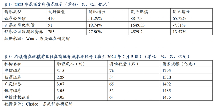 根据2023年券商融资发行数据,证券公司发行债券合计786只,同比增长37.89%,发行金额合计14996.33亿,同比增长35.13%,其中证券公司债发行数量和发行规模显著提高,分别同比增长51.29%和65.72%,平均期限为两年。从券商融资成本的角度来看,存续债券规模前五名券商融资成本均值集中于2.88%-3.15%。近年来,各家券商开始在融资融券业务方面发力,两融业务规模有所扩张,部分券商开始通过下调融资利率的方式抢占市场份额,而融资利率之间的分化现象主要受客户经营规模大小影响,大客户往往可以谈到比较低的利率,因此在债务规模超1000亿的券商融资排行榜中,前五名均为头部券商。