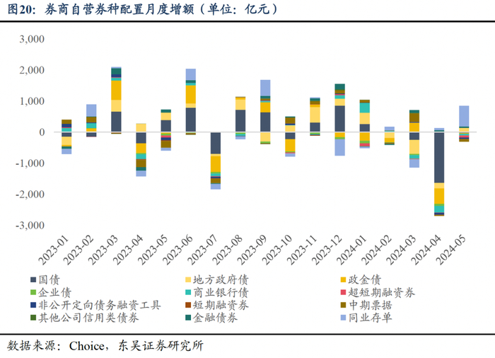 从增持月份来看,券商自营主要在季度末,即3月、6月、9月和12月增持债券。以2023年为例,增持规模分别为2036亿元、1950亿元、1296亿元和791亿元。从增持种类来看,2023年券商自营主要增持国债和地方政府债,增持规模分别为2737亿元和1659亿元;2024年1-5月券商自营主要增持同业存单和中期票据,增持规模分别为536亿元和229亿元。