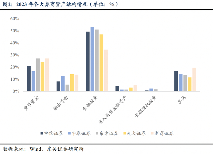 根据2023年各证券公司的总资产排名,我们从前十名、前二十名和前三十名中共选出五家券商(中信证券、华泰证券、东方证券、光大证券、浙商证券)进行资产结构对比,可以看出其资产结构具备相似特征。从选取的五家券商资产结构上来看,金融投资的资产占比区间为35%-55%,其中华泰证券的占比最高,达到了53%。在金融投资中,交易性金融资产是主要组成部分;其次是货币资金与融出资金,大多达到10%-20%的比重;最后则是买入返售资产与长期股权投资,占比在0%-5%。以上资产项目在总资产中占比约80%-90%,是券商资产经营的重点。