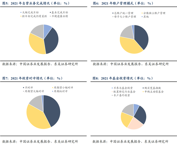 2021年券商自营业绩压力较大,对冲方式偏保守。由于2021年市场处于震荡微涨的状态,证券公司的业绩也呈现明显差异,而市场震荡的情况导致券商完成业绩指标的难度较大。从券商自营业务的履行情况上来看,2021年券商明确完成自营业务考核的占比不足一半,大部分处于距离完成业绩目标仍有差距和基本完成目标之间。在账户管理模式上,绝大部分公司选择总账户统一管理或分散独立账户管理的方式,以最大化提高投资效率、或发挥投资经理的优势。在投资对冲上,大部分券商的对冲方式较为保守,基本选择不对冲或用期货工具进行对冲,用期权对冲的占比仅为15%左右。在基金投资上,绝大多数券商会选择配置特定行业的基金或申购主动型基金,有利于有效补充自身投资能力。